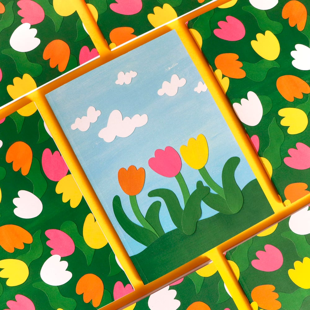 A set of two matching tulip notebooks - one Tulip Ballet, one Tulip Pattern. They feature seamless, wrap-around collage tulip designs, inspired by fields full of colourful tulips.